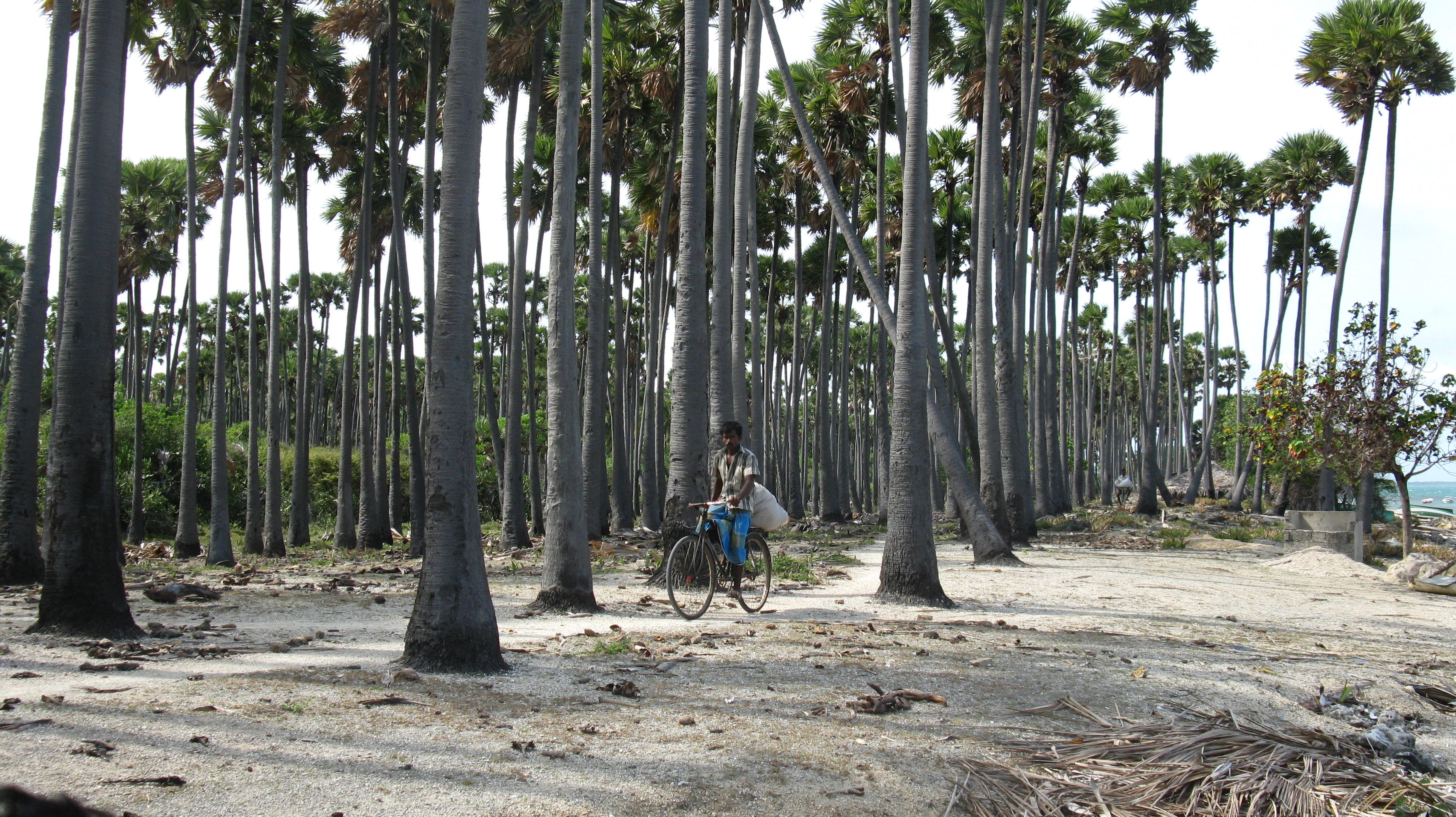 கடல் உள்வாங்கி வந்த ஒரு இடத்தில் பனைவடலிகள் கூட்டத்தில் ஒரு தென்னைமரம் நின்றது. கடலுக்கு மேல் வளைந்து நின்றது.