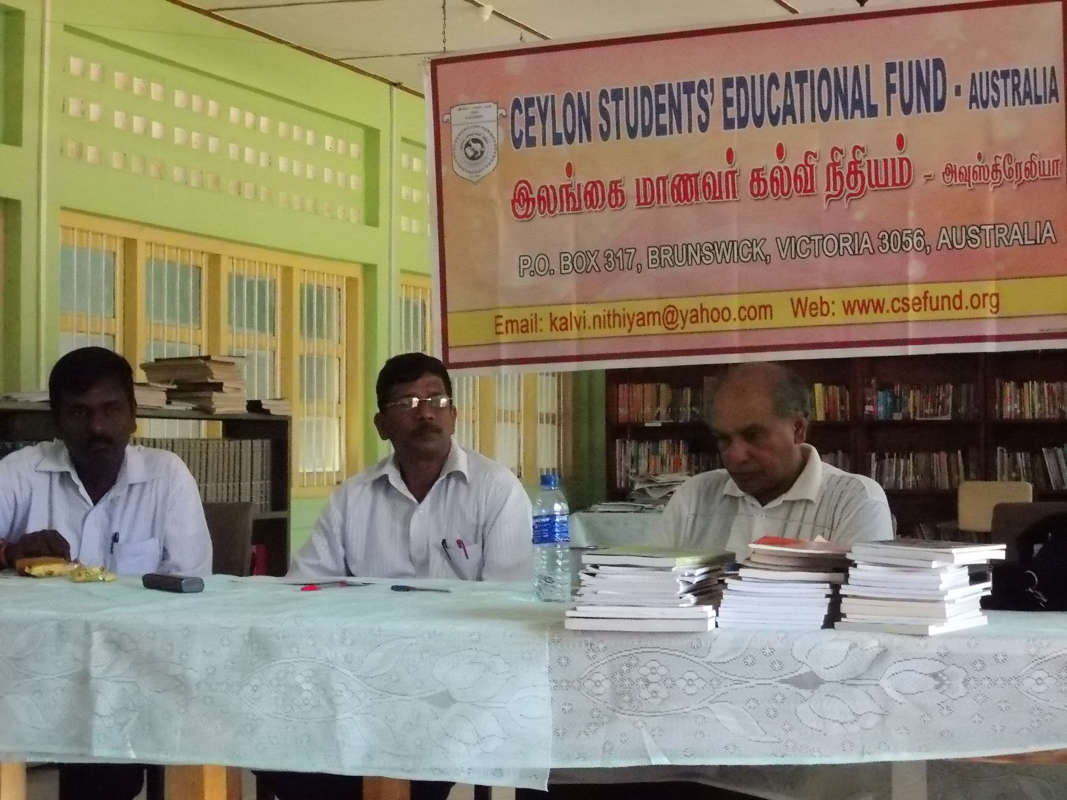 கல்லூரி ஆரம்பித்ததும் பழைய நூலக மண்டபத்தில் நிகழ்ச்சி ஆரம்பமானது. அதிபர் திரு. சிவலிங்கம் தலைமைவகித்தார். இந்நிகழ்வில் அவர் எமக்கு புதிதாக அறிமுகப்படுத்திய ஒரு மாணவன் போரின்பொழுது பாதிக்கப்பட்டவர். உயர்தரவகுப்பில் பயிலுகிறார். தாயாரையும் குடும்பத்தையும் பராமரிப்பதற்காக விவசாய கூலிவேலைகளுக்குச் சென்றவாறே படிப்பையும் தொடருகிறார். அவரது சிரமங்ளை அதிபர் குறிப்பிட்டார். எவரதும் உதவியின்றி தன்னம்பிக்கையுடன் அவர் கூலிவேலைக்குச்சென்றவாறே கல்வியை தொடருவது முன்மாதிரியானதுதான்.