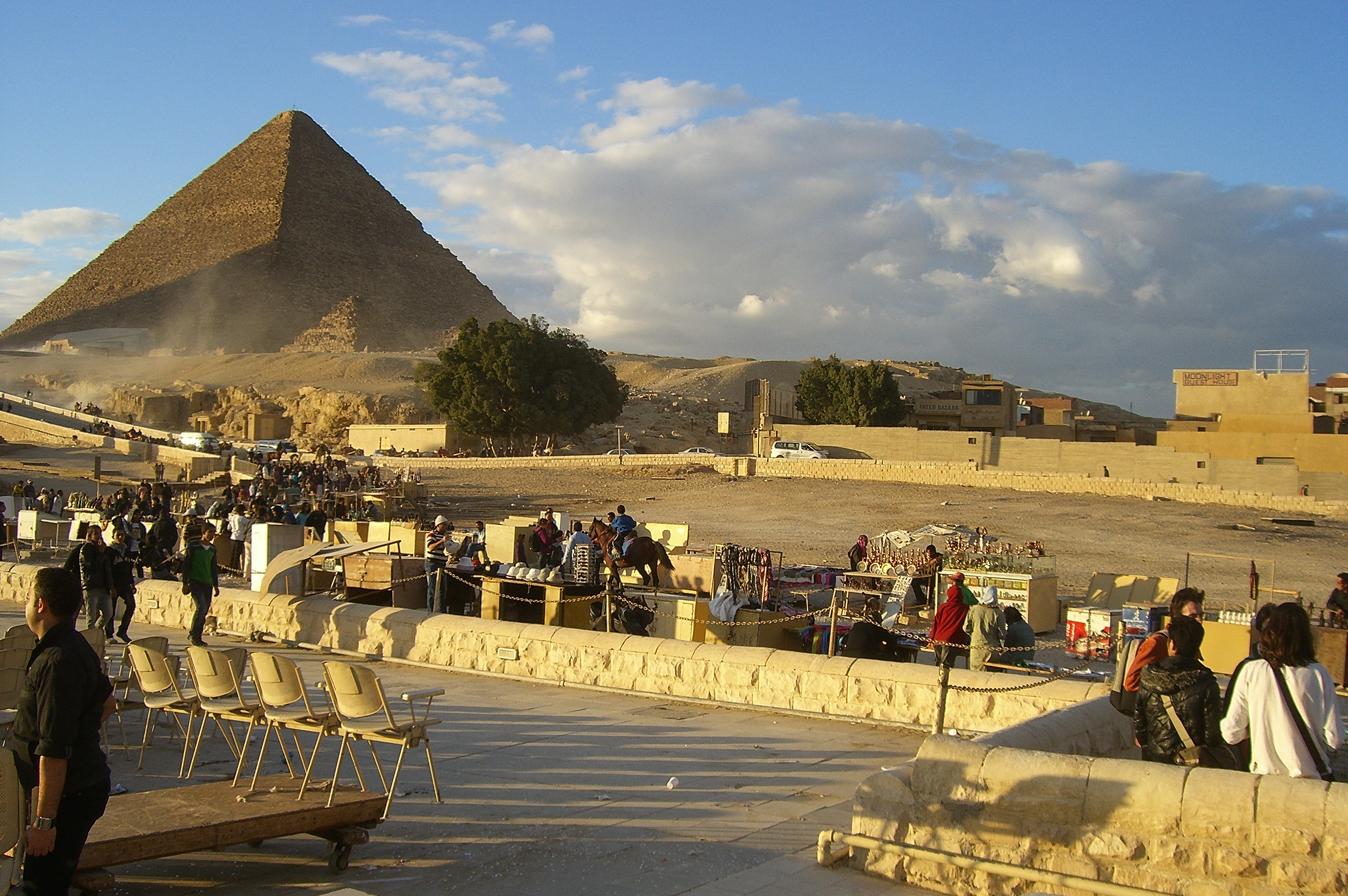 அண்ணாந்து பார்கும் போது மூன்று பிரமிட்டுகள் வானுயரத்தில் தெரிந்தன. அதன் கீழ் பகுதியில் ஓட்டகங்களை வாடகைக்குவிடுபவர்களும் உல்லாசப் பிரயாணிகளுக்கு பொருட்களை விற்பவர்களும் நின்றார்கள். கால்புதைய மணலில் நடக்கும் இந்த ஒட்டகங்கள் பிரமிட் கட்டும்காலத்தில் எகிப்தில் இருந்திருக்கவில்லை பிற்காலத்திலே அரேபியாவில் இருந்து கொண்டுவரப்பட்டவை.