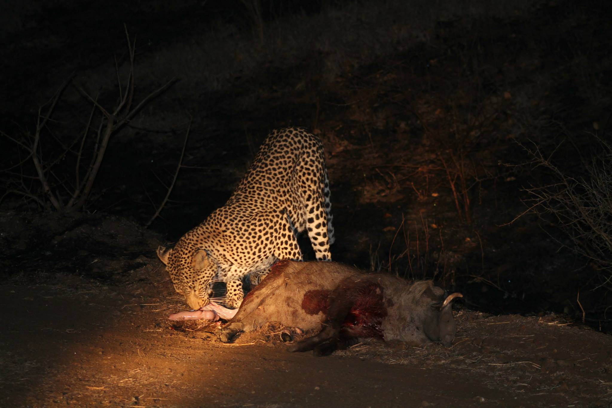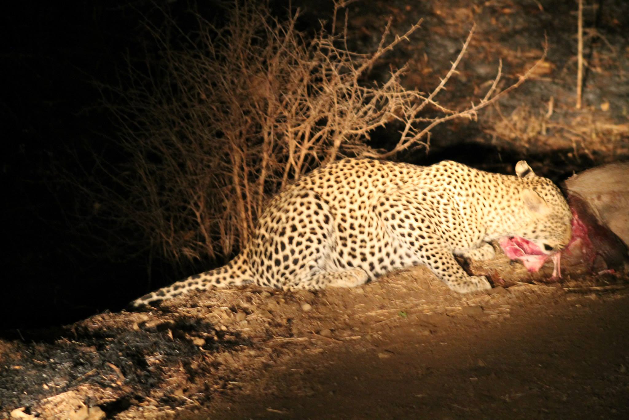 ஓடிக்கொண்டிருந்த வாகனம் எதிர்பாராமல் நின்றது. வாகன சாரதி தனது கையில் இருந்த பிரகாசமான லைட்டை அடித்தபோது எமது வாகனத்தில் இருந்து ஐந்து மீட்டர் முன்பாக தார்பாதையின் ஓரத்தில் புதிதாக வேட்டையாடப்பட்ட பன்றியின் கழுத்தில் இருந்து இரத்தம் வழிய சிறுத்தை உண்டு கொண்டிருந்தது.
