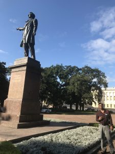 கோட்டையருகில் உள்ள பூங்காவில் ரஸ்சிய இலக்கியத்தின் தந்தை எனப்படும் புஷ்கினது சிலையைப் பார்க்க முடிந்தது.கவிஞர் அலக்ஸ்சாண்டர் புஷ்கின், மாமன்னர் பீட்டரைப்போல் இந்த நகரத்தில் எங்கும் நிறைந்தவர். 1799ஆம் ஆண்டுபிறந்தவர். இவரது தாய்வழி ஆபிரிக்க முஸ்லீம். ஆனால் புஷ்கினது தந்தை வழி ரஸ்சிய பிரபுத்துவ குடும்பம். பீட்டர்மன்னரின் இராணுவத்தில் அதிகாரியாக இருந்தவரது மகளே புஸ்கினின் தாய். இந்த ஆபிரிக்க கலப்பைபற்றி பெருமையாக புஷ்கின் பேசியுள்ளார். சிறுவயதில் மிகவும் துடியாட்டமும் குறும்புத்தனமும் கொண்ட புஷ்கின் அரச நிர்வாகிகளை பயிற்றுவிக்கும் கல்லூரிக்கு சென்றாலும் மன்னருக்கு எதிரான கோசங்களை கிளப்பியதால், தலைநகரத்தில் இருந்து வெளியேற்றப்பட்டார்.