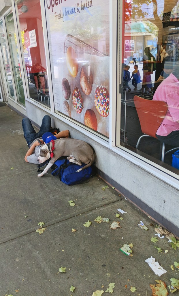 காலை பத்து மணியளவில் எழுந்து மக்டொனால்ட்ஸின் காலை உணவை உண்பதற்காக அங்கே சென்றபோது ஒரு இளைஞனும் அவனது நாயும் அன்னியோன்னியமாகக் கடைவாசலருகே ஆழமான உறக்கத்திலிருந்தார்கள். முக்கிய மாக வாரவிடுமுறைநாளில் பல இடங்களில் கடைகளின் முன்பு உறங்குபவர்களைப் பார்க்க முடிந்தது. கனடாவில் குளிர் குறைந்த இடமென்பது வன்கூவர் என்பது உண்மைதான். டொரண்டோவில் படுத்திருந்தால் பனிக் கட்டியாக உறைந்திருப்பார்கள் .