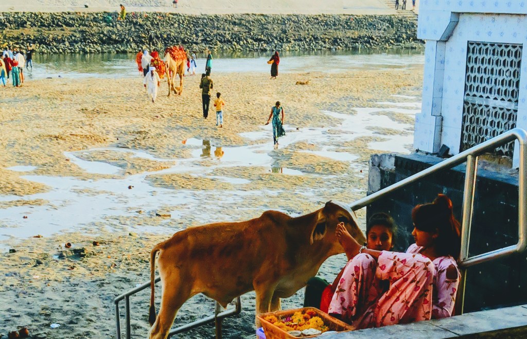 அரபிக்கடலின் கோமதி என்ற சிறிய ஆறு சங்கமமாகிறது. ஆறு என்றாலும் அங்கு கடல் பெருகினால் உப்புத்தண்ணியும் ஓடும். கடல் வற்றும்போது நிலம் தெரியும். அதில் ஒட்டகங்களுடன் பலர் சவாரிக்காகக் காத்து நின்றார்கள். நாங்கள் ஏறாத போதிலும் பணத்தைக் கொடுத்துப் படத்தை எடுத்துக்கொண்டோம். இங்கிருந்து பார்க்கும் போது ஒரு கலங்கரை விளகம் உள்ளது மாலை நேரத்தில் அரபிக்கடலில் ஆதவன் மறைவதை அங்கு நின்று பார்ப்பது மனதுக்கு இதமாக இருந்தது