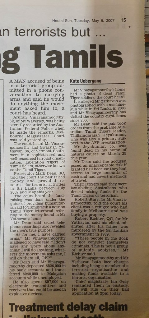 பிற்காலத்தில் சுனாமி நிவாரணத்துக்காக சேகரித்த பணத்தைக் கையாடியதாக விடுதலைப்புலி ஆதரவாளர்கள் மூவரை அவுஸ்திரேலிய அரசு கைது செய்தது. உதயம் பத்திரிகை நிதி விடயத்தில் லாபம் தராது விட்டாலும், இறுதி மூன்று வருடங்கள் கைப்பணத்தைப் போடாது நட்டமின்றி வெளிவந்தது.