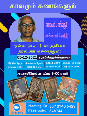 அவுஸ்திரேலியா கன்பராவில் இயங்கும் தமிழ்க்களஞ்சியம் ( Tamil Trove ) அமைப்பினால் காலமும் கணங்களும் தொடரின் முதல் அங்கமாக இந்த ஆவணக்காணொளி வெளியீடு அமைகின்றது.