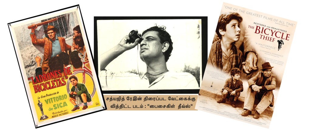 விற்றோறி ஓ டி சீகா (Vittorio De Sica) இயக்கிய ‘சைக்கிள் திருடர்கள்’ – Bicycle Thieves (Ladri di biciclette) எனும் இத்தாலிய படம் இவற்றில் முதன்மையானது என ரே ஒரு பேட்டியில் சொல்லியிருந்தார். தியேட்டரை விட்டு வெளியே வரும் போதே ‘இனி நான் ஒரு இயக்குனர்தான்’ என அவர் இதயத்தில் பச்சை குத்தியாயிற்று.
