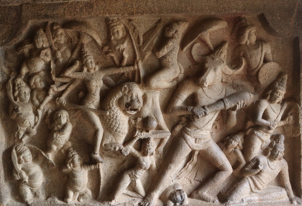அடுத்தது மகிஸவர்தனி குகை. அதனைப் பார்ப்பதங்கான ஆவலை எனக்குத் தூண்டியவர் கவிஞர் இந்திரன். திராவிட சிற்பக்கலை என்ற நிகழ்வில் அவர் பேசும்போது மகிசாசுரன் சண்டையைப் பற்றிய இந்தச் சிற்பத்தைப் பற்றிச் சிலாகித்துப் பேசினார். அதனால் ஆதனைப் பார்க்கவேண்டும் என்ற எனது ஆர்வம் எனக்குள் ஏற்பட்டிருந்தது. இந்தக்குகையில் சுவரோவியம் போல் மூன்று காட்சிகள் உள்ளன. முருகன் குழந்தையாக சிவன் பார்வதியுடன் சேர்ந்திருப்பது. அது நடுவே இருக்க, ஒரு பக்கத்தில் விஷ்ணு சயனம் செய்யும் காட்சியும், மறு பக்கத்தில் மகிசாவர்தனியின் போர்க் காட்சியும் இடம்பெற்றுள்ளன.