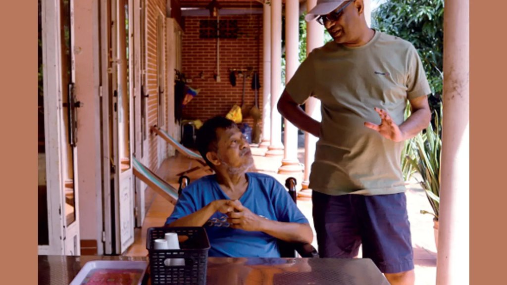அந்த வளவின் வாசலுக்குப் போனதும் வராந்தாவிலிருந்த வயதான ஒருவர், சிரித்தபடி உற்சாகமாகச் சக்கர நாற்காலியிலிருந்து கொண்டு கையை அசைத்து வரவேற்றார். அவரது இரண்டு கைகளும் பறவையின் இறக்கையாக காற்றில் மேலும் கீழும் உற்சாகமாக அசைந்தது. அருகில் சென்று பார்த்தபோது அவரது இடுப்புக்குக் கீழ் அவரது கால்கள் அசையவில்லை என்பதை தெரிந்துகொள்ள முடிந்தது. அவருக்குப் பாரிச வாதம். அவர் எமது நிறத்திலிருந்தார். ஆனால், கொஞ்சம் சப்பை மூக்கு. இடுங்கிய கண்கள். மொத்தத்திலொரு பால் கோப்பியாகத் தெரிந்தார்.