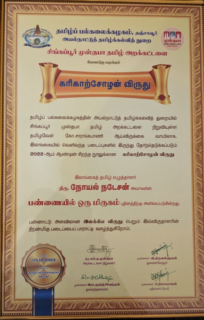 இலங்கை – அவுஸ்திரேலியா எழுத்தாளர்கள் தமிழ்நாடு தஞ்சாவூர் பல்கலைக் கழகத்தின் அயல்நாட்டுத் தமிழ்க் கல்வித்துறையில் , சிங்கப்பூர் முஸ்தபா அறக்கட்டளை நிறுவியுள்ள தமிழவேள் கோ. சாரங்கபாணி இருக்கை வாயிலாக வழங்கப்படும் இலங்கை, மலேசியா, சிங்கப்பூர் நாடுகளைச்சேர்ந்த இலக்கியப்படைப்பாளிகளுக்கான கரிகாற்சோழன் விருதுகள் வழங்கும் விழா கடந்த 05ஆம் திகதி நடைபெற்றது.இம்முறை இந்த விருதுகள் இலங்கையரான , தற்போது அவுஸ்திரேலியாவில் வதியும் எழுத்தாளர் – விலங்கு மருத்துவர் நொயல் நடேசன் எழுதிய பண்ணையில் ஒரு மிருகம்நாவலுக்கு வழங்கப்பட்டுள்ளது.அத்துடன் இலங்கை எழுத்தாளர் சிவஆரூரன் எழுதியுள்ள ஆதுரசாலை என்ற நாவலுக்கும் வழங்கப்பட்டுள்ளது.சான்றிதழும் தங்கப்பதக்கமும் குறிப்பிட்ட எழுத்தாளர்கள் பெற்றுள்ளனர்.நொயல் நடேசன், சிறுகதை, நாவல், பயண இலக்கியம் மற்றும் விலங்கு மருத்துவம் தொடர்பான அபுனைவு படைப்புகள் பலவும் எழுதியிருப்பவர். இவரது சில நூல்கள் ஆங்கிலத்திலும் சிங்களத்திலும் வெளிவந்துள்ளன.சிவ. ஆரூரன் சில வருடங்கள் இலங்கை சிறைகளில் தடுத்துவைக்கப்பட்டு, பொதுமன்னிப்பின் கீழ் விடுதலை செய்யப்பட்டவர்.சிறையிலிருந்தவாறே இலக்கியப்பிரதிகள் எழுதியிருக்கும் சிவஆரூரனின் ஆதுரசாலை நாவலுக்கு இலங்கையில் தேசிய சாகித்திய விருதும் கிடைத்திருக்கிறது.–0–