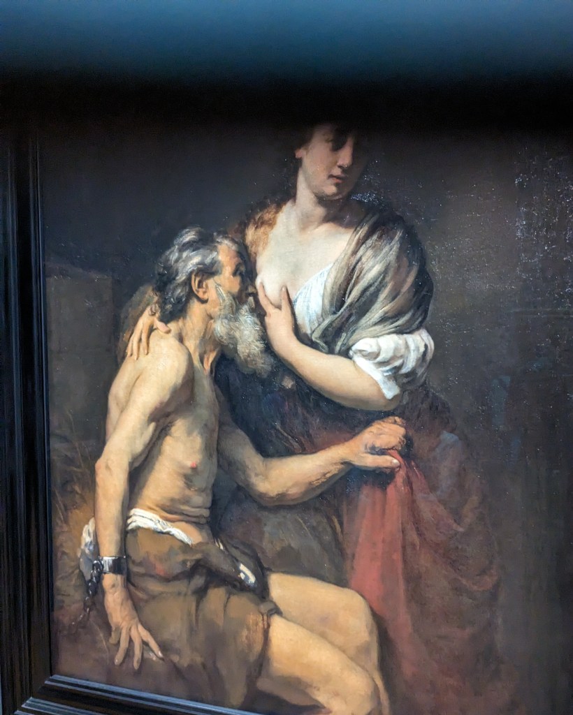 அதேபோல அங்கிருந்த ஓவியம் ரெம்பிராண்ட்டின் மாணவனாகிய டொரஸ்ட் வில்லம் (DROST, Willem) ரோமன் சிறையில் மரண தண்டனைக்கு காத்திருந்த ஒருவருக்கு உணவு கிடைக்காமல் பட்டினி போட்டார்கள். ஆனால், அவரது மகளை குழந்தையுடன் சிறைக்கு ஒவ்வொரு நாளும் வந்து பார்க்க அனுமதி கொடுத்தார்கள் . பட்டினி போட்ட சிறைவாசி உடல், உரம் குறையாமல் இருந்தார் . சிறைக்காவலர்கள் இறுதியில் மகளின் முலையில் இருந்து தந்தை பால் கொடுத்திருக்கிறார் என்பதை அறிந்து இறுதியில் அந்த சிறை வாசியை விடுதலை செய்தார். குழந்தையை அணைத்தபடி சிறைகம்பிகளுடாக பால் கொடுக்கும் அந்த காட்சி பார்ப்பவர்கள் மனதில் எக்காலத்திலும் மறையாது. அந்த ஓவியத்திற்கு ரோமர்களின் தயாளகுணம் (Roman Charity) எனப்பெயரிடப்பட்டிருந்தது.
