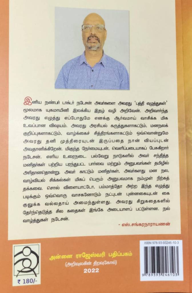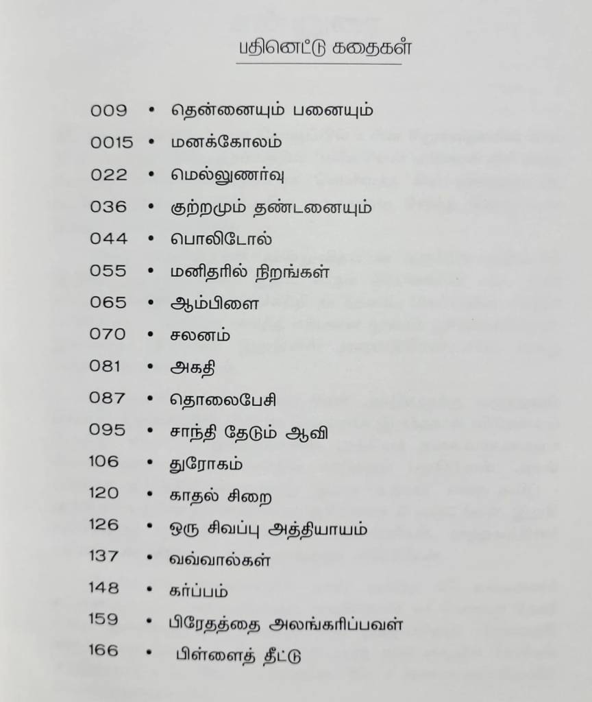 நோயல் நடேசன் சாரின் 18 சிறுகதைகள் அடங்கிய தொகுப்பு. எளிய சிக்கலில்லாத படம் பார்த்து கதை சொல்லும் நேரான கதைகள். உறுத்தாத முடிவுகள். ஆங்காங்கே வரும் உதாரணங்கள் ஆச்சரியமூட்டுகின்றன. சில சங்கட தருணங்களை விவரணைகளை ஜஸ்ட் லைக் தட் சொல்லிச்செல்கிறார். கம்மி ரூவாய்க்கு இந்த கிராக்கிதான் கிடைக்கும் ஜோக் (ஒரு சிவப்பு அத்தியாயம்), சில வியாதிகள் (schizophrenia, Imposter syndrome, Pseudopregnancy) கதைகளாகி இருக்கிறது. பாலிடால் குடித்த சீலாவதியும் ஆமிக்காரனுக்கு இணங்கி ஊரைக்காப்பாற்றிய ராசாத்தியும் மனதை பாதிக்கிறார்கள்.இந்த கதைகளை சொல்லும் விதத்தில் நோயல் சாரிடம் ஒரு detached தன்மை தெரிகிறது. ஒரு 3rd man view. கதை விமர்சனமாக விவரமாக சொல்ல எனக்கு பிடிப்பதில்லை. நீங்களே படித்துக்கொள்ளுங்கள்.